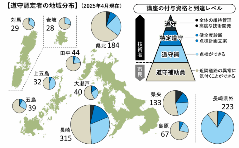 この課題に対して、長崎大学持続可能社会創造センターでは、社会インフラの維持管理に関する知識・技術の体系的な習得を通して、地域内に広域かつ階層的なインフラ人材ネットワークを構築する「道守(みちもり)養成講座」を運営しています。本講座は、知識や経験などのレベルに応じた3段階の技術者に加えて、地域のインフラの“見守り役”となる市民を養成するプログラムです。2025年4月現在、1,134人(うち長崎県内の離島振興法指定地域に128人)の道守認定者が、安全で快適な暮らしを守る「地域の“人財”」となっています。