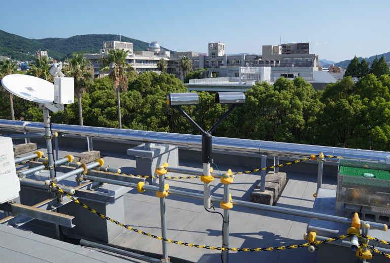 工学部1号館屋上に設置されている降雨観測機器。❶は上空に雨粒があると電波が反射されるマイクロレインレーダー、❸はセンサーの上に落ちた雨粒を計測するディスドロメータ。2年前、新たに雨粒の大きさを測る装置❷が追加されました。常時これらの機器から、データが送られてくるシステムです。「工学部棟の屋上に設置した観測機器で、線状降水帯の発生時の雨量と雨粒の大きさを観測しています。今のところ2022年のスタート以降、本学の上空一帯に線状降水帯が発生したのは1回のみですが、データを分析したところ、一般的には強い雨が1時間に100ミリの雨量であるのに対して、瞬間的に180ミリの雨量を計測しました。一方、気象庁と国土交通省が各地に設置した雨雲レーダーの情報は、1時間に数十ミリ程度でした。なぜ差が生じたのか考えました。まず雨雲レーダーは、雨雲の動きを見るという点で有力な情報を得られますが、雨量を測る精度はそれほど高くありません。また、そもそも長崎市内には雨雲レーダーが設置されておらず、福江島、福岡、熊本のレーダーが計測しています。距離が離れているものを見るのですから、当然精度は下がります。線状降水帯に限らず、正しい気象情報を広く発信するためには、現地に設置した計測器の情報と雨雲レーダーの情報を照らし合わせるといった対策が必要でしょう」。
