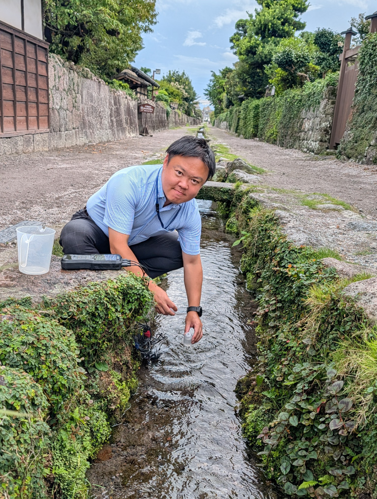利部慎准教授は雨が地中に浸透してから、地下水として流れて地表に湧いてくるまでの年月を測定する研究が専門です。