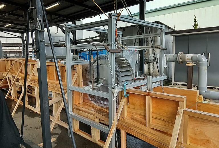 企業と合同で行った実証実験の様子。実寸の4分の1程度の模型を製作して、試験が実施されました。「持続可能という点においても、例えば工事費の負担が大きい100kW級の小水力発電所を一つ造るという策だけでなく、10kW級の発電装置を農業用水路に10箇所設置することも有効と考えました。平坦な用水路を流れる水の運動エネルギーは小さいため、落差1.5メートルのより大きな位置エネルギーの回収を可能にする胸掛け水車を開発しました。この胸掛け水車は灌漑期の流量で10kW発電することができ、一般家庭およそ25世帯分の消費電力を持続的に賄うことができます」。