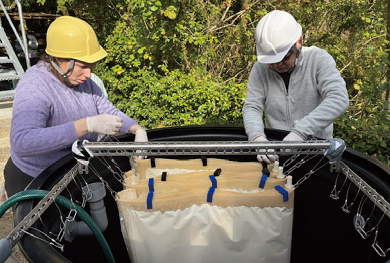 通常はロール状になった膜が多い中、汚れを除去しやすいよう封筒状に改良した膜を使用。フィルター、メッシュ、不織布などが層になっています。フィルターの孔のサイズは、1ナノメーター(1mmの100万分の1)未満。肉眼では見えません。「ベトナムの河口域では、河川水を浄化した水が水道水として使われています。しかし、下水処理の普及率が低く、汚水を含んだ水が河川に垂れ流されているため、下流に向かうほど水質がひどく悪化していきます。肝心の浄水技術は未だに追いついていないため、飲用水はペットボトル水や煮沸した水に頼っています。そこで初期投資や運用費用を低コストに抑えられる水浄化技術を開発しました。5年計画のプロジェクトは折り返し地点に来ており、現地の水道公社の協力の下、ハイフォン市内の浄水場で半年間の実証実験を行っている段階です。ハイフォン市は人口約200万人の大都市ですから、開発や実証実験が順調に進めば、ベトナム全土への普及にもつながるでしょう」と藤岡教授。
